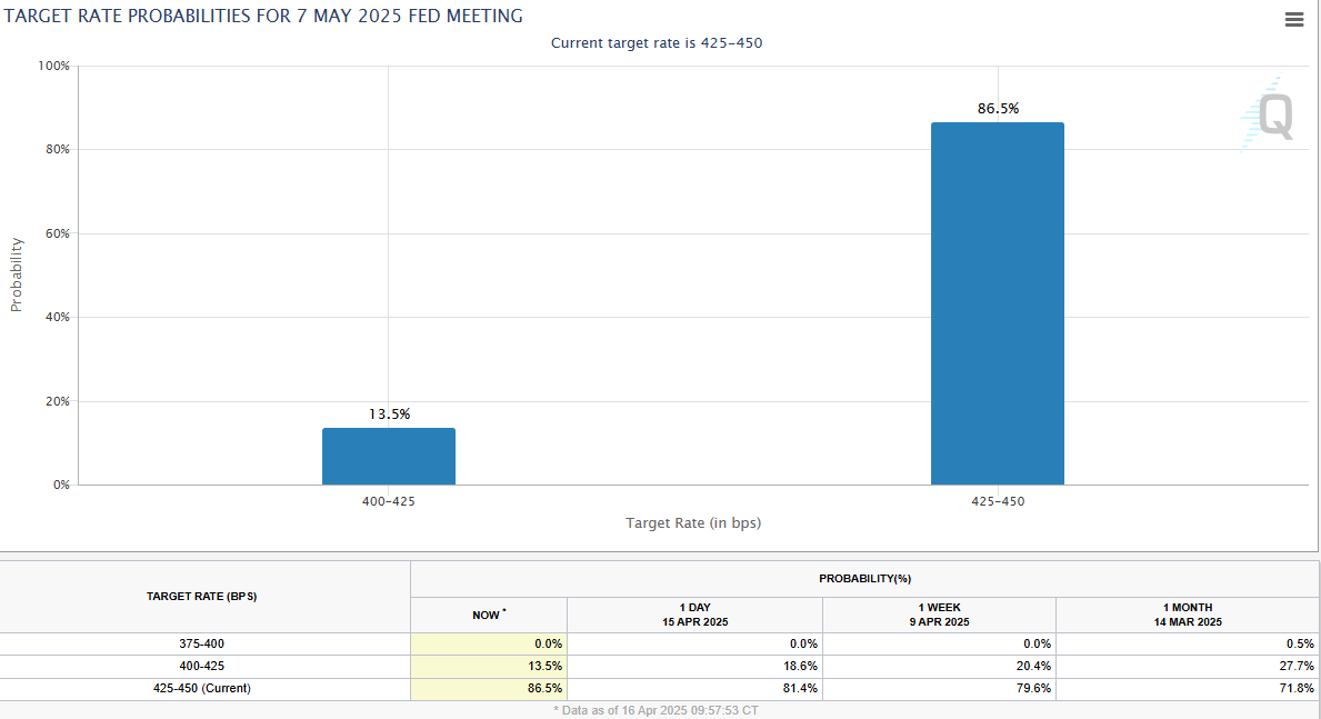 The Fed Funds Futures curve has been telling the story in slow motion. One month ago, markets priced in a 27% chance of a 25bps cut at the May 7th meeting. Last week? 20.4%. Yesterday? 18.6%. And today? Just 13.5%. Not gone entirely — but fading. That little bit of hope? It's leaking.