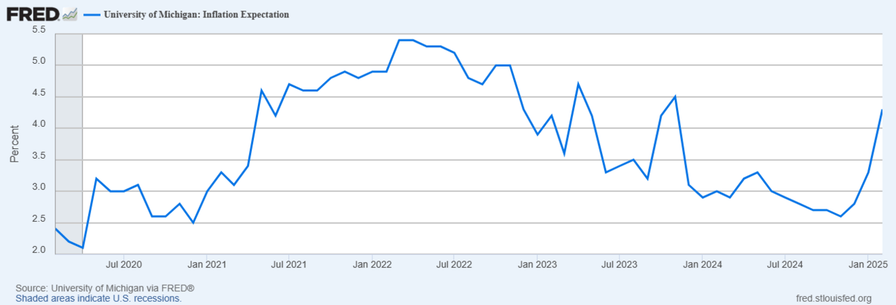 Just look at the University of Michigan’s Inflation Expectation data. After trending down for most of 2023 and early 2024, expectations are now rising — fast. That spike into 2025 tells you exactly what the Fed is worried about. Inflation might be coming back before it’s fully under control.
