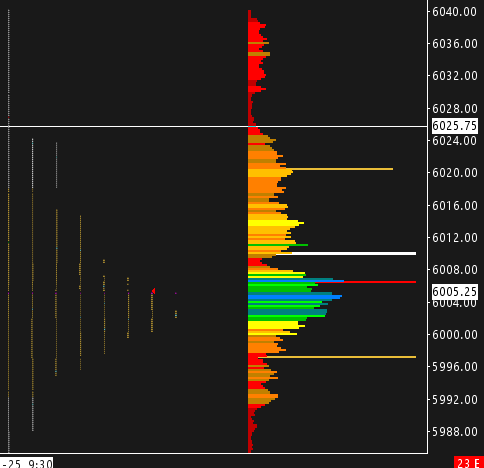 Notice something? Monday’s profile looks like a mini double distribution. And guess what? The market has respected 6025 like it owes it money. It’s the top of the upper distribution, where buyers struggled to trade above.